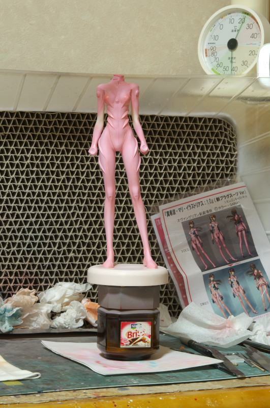 スーツ塗装後最終仮組の画像。この時初めて全体が見れます。ピンクが薄かったか?ピンクのグラデーションがあまり無かったですね。ピンクを濃くするにはマスクをしなおすのは非常にめんどいので完了に。