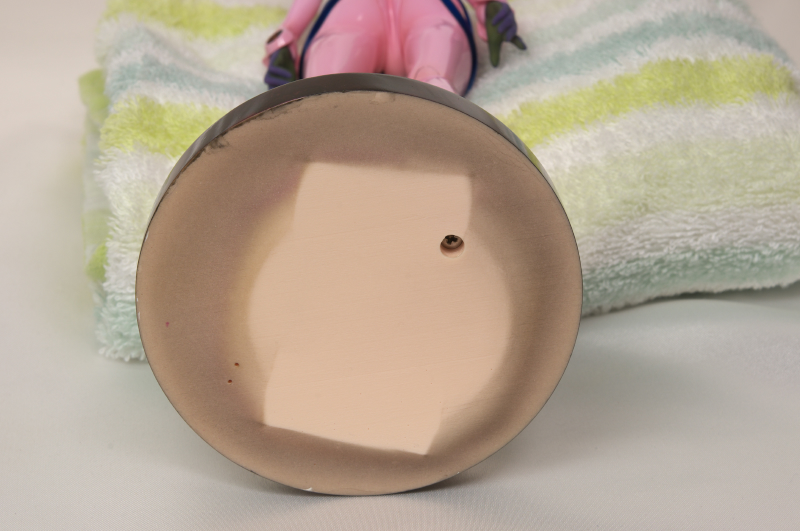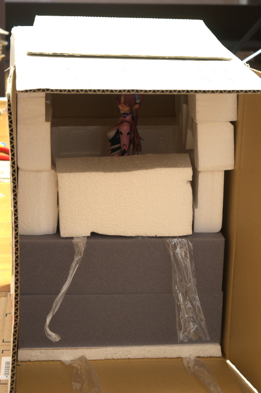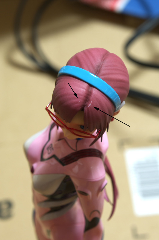 固定が不十分で中央部のスポンジが傾いたか或いは外れてフィギュア頭部にダンボールが接触して塗装剥げが発生したと思われます。
